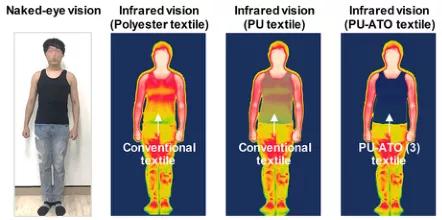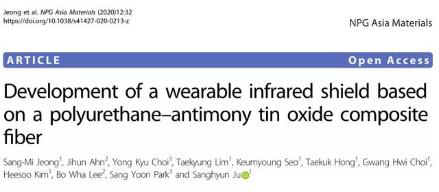 韓國(guó)京畿道大學(xué)Sang-Mi Jeong等研究人員成功合成了聚氨酯-銻錫氧化物(PU-ATO)復(fù)合纖維,與常規(guī)的聚酯或PU織物相比,本研究開(kāi)發(fā)的PU-ATO復(fù)合纖維紡織品具有出色的IR和熱輻射屏蔽性能,即使暴露于?20°C和+80°C的重復(fù)溫度變化以及30天的長(zhǎng)期溫度變化的十個(gè)循環(huán)中,制成的PU–ATO復(fù)合纖維仍具有穩(wěn)定的IR和熱輻射屏蔽性能。PU-ATO復(fù)合纖維的表面被制成疏水性,以防止由于PU-ATO復(fù)合纖維被吸收的水潤(rùn)濕而導(dǎo)致IR和熱輻射變形。
