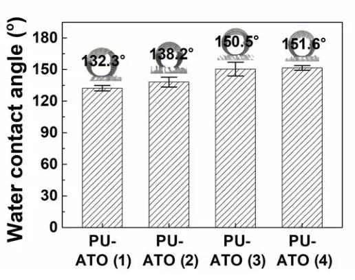 由于纖維吸水會(huì)導(dǎo)致IR圖像變形,纖維的疏水性對(duì)于保持一定水平的紅外和熱輻射屏蔽能力至關(guān)重要。使用接觸角分析儀評(píng)估該復(fù)合纖維的水潤(rùn)濕性。如圖4所示,不同濃度(0.5、1.5、3.0和4.0 mmol)的PU-ATO(1-4)復(fù)合纖維的水接觸角均≥130°,顯示出疏水性,因此,織物表面上的水滴沒(méi)有被吸收,而是易于滾落。