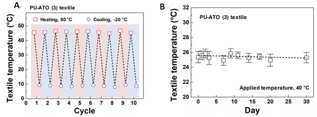 圖5 根據(jù)溫度和時(shí)間的變化,反復(fù)評(píng)估PU–ATO(3)復(fù)合紡織品的紅外和熱輻射屏蔽性能。A, 經(jīng)過(guò)反復(fù)加熱(+80°C)和冷卻(?20°C)循環(huán) PU–ATO(3)復(fù)合紡織品的表面溫度。B, 每天施加40°C的溫度8小時(shí)(共30天)后,PU–ATO(3)復(fù)合紡織品的表面溫度