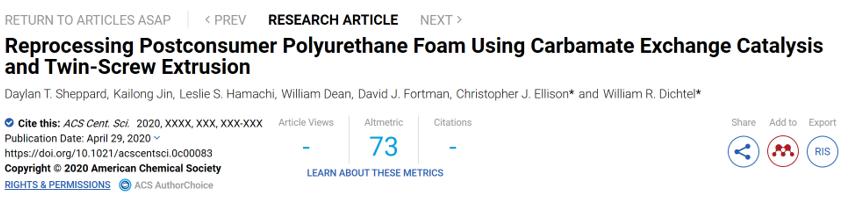在本篇文章中,研究人員成功證明了通過引入DBTDL為催化劑來使PU熱固性塑料進行再加工處理,使用工業上的雙螺桿擠出技術有效地從PU泡沫中除去空氣,從而對PU泡沫進行再加工,并證明了這種再處理方法對市售PU泡沫的適用性。我們相信,這項技術不僅能夠將各種PU廢料回收再處理成高價值的材料,為工業界對PU泡沫廢料的回收利用鋪平了道路,而且將極大地激發其他市售工業材料的回收利用!
