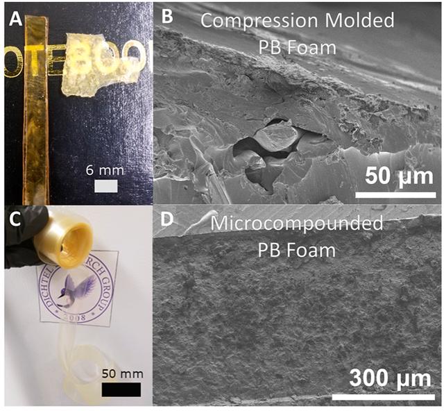 圖3顯示了研究人員通過傳統壓縮模塑法和雙螺桿擠出法對PU泡沫再處理的對比,可以看出壓縮模塑法對PU泡沫的后處理效果較差,而通過雙螺桿擠出機則能夠有效地將泡沫中的空氣去除,得到具有優異機械性能的材料;SEM表征結果也明顯看出,與壓縮模塑相比,雙螺桿擠出機得到的材料質地均勻,不存在明顯的空隙。