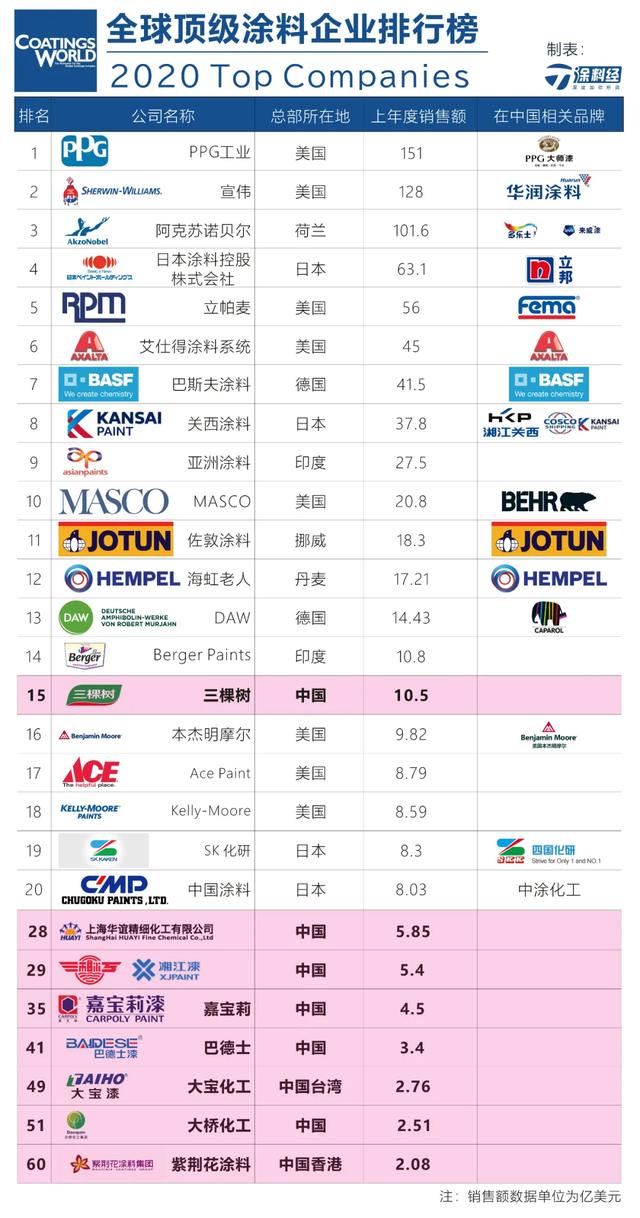 在中國涂料企業的表現方面,三棵樹憑借2019年度銷售業績的大幅增長,也使得排名得到大幅躍升,以10.5億美元的銷售額排名第15,成為首家躋身全球前20的中國涂料企業;上海華誼精細化工有限公司(包含原上海涂料,簡稱華誼精化)以銷售額5.85億美元排名第28;湘江涂料以5.39億美元排第29名;嘉寶莉以4.50億美元位列第35;巴德士以3.4億美元列第41;大寶化工以2.76億美元列第49;大橋化工以2.51億美元列第51;紫荊花涂料集團以2.08億美元列第60。