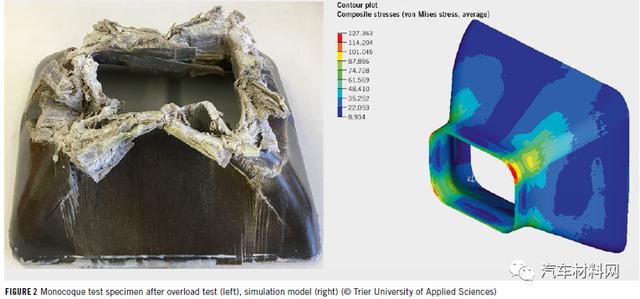 亞麻纖維的比重比碳纖維低,而強度和彈性模量值與玻璃纖維相似。由于它們僅需要大約1-5%的能量輸入,在生產過程中會顯著降低CO2排放,因此車輛的整體能量平衡性具有優勢。亞麻纖維增強組件在減振、發生碰撞時的碎裂行為方面提供了顯著優勢,并且沒有有害的纖維粉塵,方便處置或回收利用。目前,NFRP材料用于高應力部件的可靠材料數據和經驗相對較少。因此,該項目的主要致力于確定材料特性并進一步開發尺寸標注方法。通過使用有限元方法(FEM)進行計算,可以實現結構優化,對其中涉及到的纖維層數、鋪層方向和順序進行模擬,通過靜態和動態載荷測試進行了驗證(具體如圖2)。在考慮前、后和側面碰撞安全性時,NFRP制成的部件可通過管狀或波浪形結構的壓碎實現約30kJ/kg的比能量吸收,這是傳統鋼制碰撞盒比能量吸收的兩倍左右,具體測試結果如圖3所示。