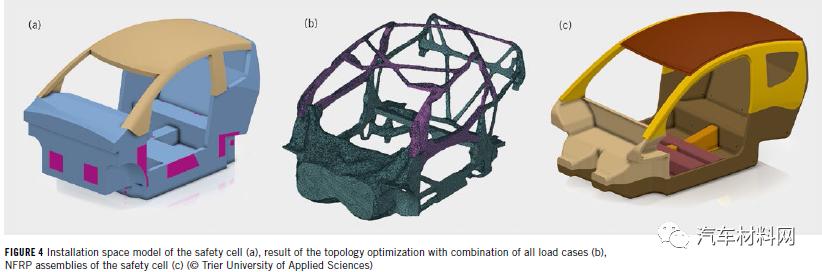 SafetyCell安全車身結構原型如圖4(a),它是根據不同身材乘員的人體工程學研究而開發的,并考慮了驅動器和底盤結構的優化。接下來,基于前、后、側面碰撞可能帶來的碰撞載荷的路徑,進行拓撲優化,如圖4(b)。最后,考慮亞麻纖維增強復合材料的結構(如纖維角度、鋪層等),進一步轉換為圖4(c)。