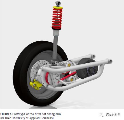 該車采用了后輪驅動,其優點主要包括:可以在駕駛和車輛啟動時進行扭矩矢量控制,從而確保即使在后軸單獨電動制動時,車輛也可以在中等橫向加速度下保持穩定。這意味著可以完全省去后輪上的機械制動器,進一步減少了能源需求。該驅動系統是通過驅動裝置的擺臂實現的,擺臂作為帶有懸架支柱的拖臂同時接管車輪的導向裝置,在乘用車中是一種新穎設計,具體如圖5。緊湊的水冷式發動機位于由控制臂驅動的旋轉軸附近,與輪轂電機相比,這大大減少了非懸掛的質量,并且由于車輪的垂直加速度而導致的機械應力更低。為了通過V形皮帶將扭矩和速度傳遞至驅動輪,該車采用了合作伙伴Continental的P0混合動力驅動裝置進行改裝。目前用于測試的驅動裝置原型為開放式管狀結構,項目組將更改為由鑄鋁制成的封閉式控制臂結構。