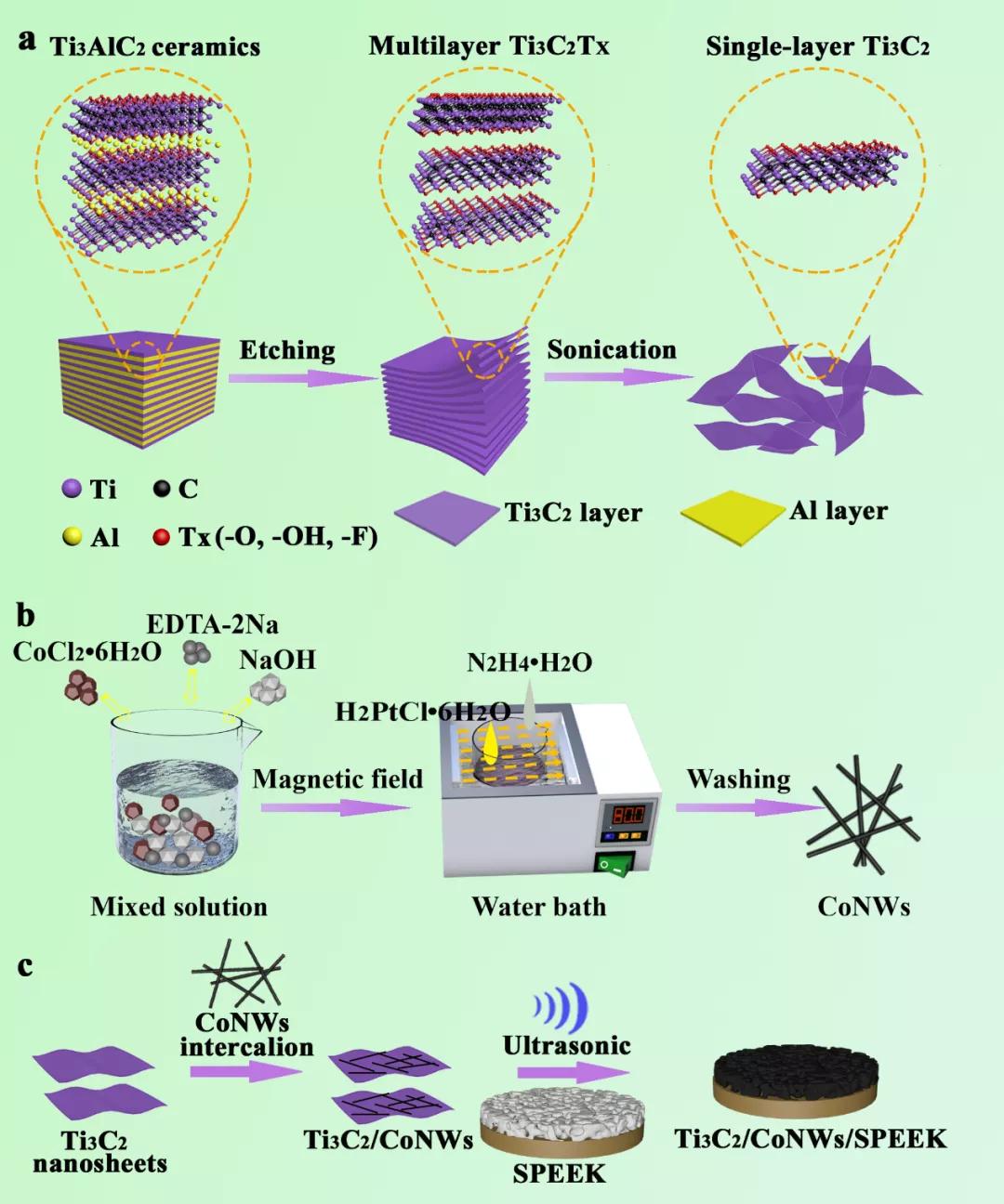 圖1. Ti3C2/CoNWs二維納米異質結及改性PEEK表面示意圖