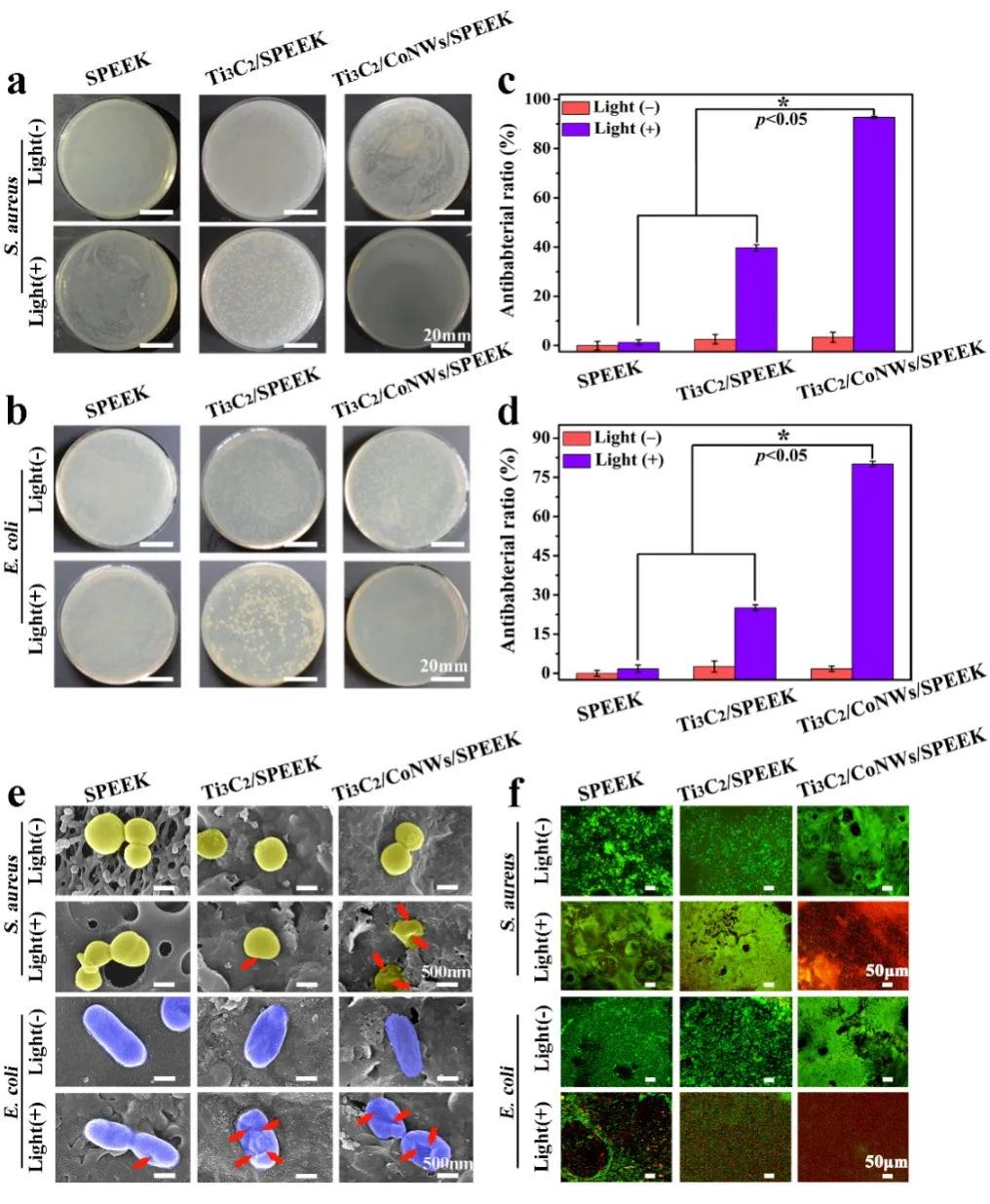 聚醚醚酮(PEEK)醫用植入體的術后反復細菌感染仍然是臨床上棘手的難題。致病性細菌感染已成為全球公共衛生的最大威脅之一,其引起的高死亡率和難以治愈的問題一直是研究的熱點??股厥悄壳皯米顝V泛的細菌性傳染病的治療方法。然而,長期濫用抗生素會產生大量的耐藥細菌,最后使病患“無藥可救”。由于耐藥細菌的爆 炸性產生,光治療策略為無抗生素治療帶來了希望。歷經長期研探索,越來越多學者已經清楚地認識到,單模型光殺菌(光熱或者光動力)很難有效或完全根除細菌感染。因此,如何賦予PEEK植入體雙重光殺菌特性是保障植入體術后不發生反復感染的關鍵。